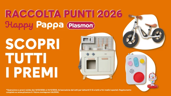 Dal 15 Marzo al 15 Dicembre è attiva la raccolta punti Happy Pappa. Acquista prodotti Plasmon, accumula Punti Pappa e scegli tra 9 fantastici premi!